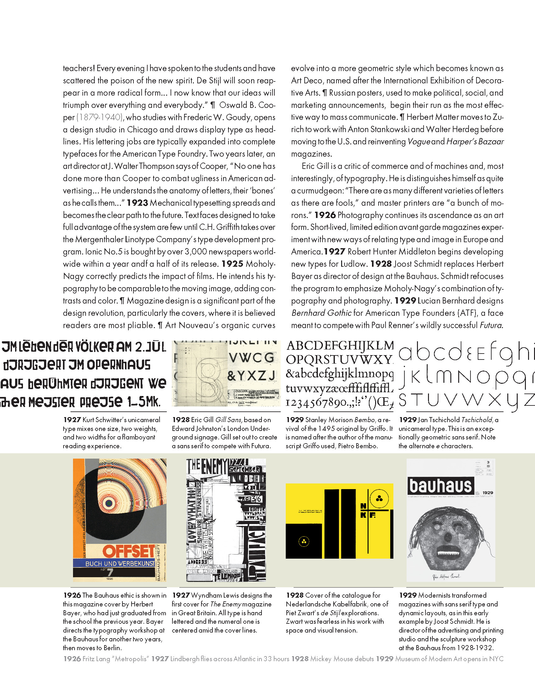 Communication Arts Magazine – “European and American Typography in the 1920s” (Page 2 and Page 3) The 1920s is a decade of exceptional typographic growth and experimentation. It is the decade in which “graphic design” is given its name by W.A. Dwiggins. Emerging from the First World War, the arts communities in Europe and America are already deeply involved in a succession of movements that continue through mid-century. Ideas are churning and invention is in the air. ¶ The world is changing rapidly at the close of WWI. Cubism, De Stijl, Suprematicism and Dadaism are flourishing. The Russian Revolution in 1917 propels Russian artists to new ways of seeing. The revolution ruins nearly every physical tool they have to work with, so imaginative use of what is left lying around is essential…
