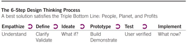 Design Thinking is a defined way of exploring and solving problems. It works on any problem in any field. In this context, design means “to plan.” It does not refer to artistic activity, though graphic, industrial, interior and other disciples within the design fields can certainly be employed in the solution-finding method. The 6-Step Design Thinking Process looks like this: