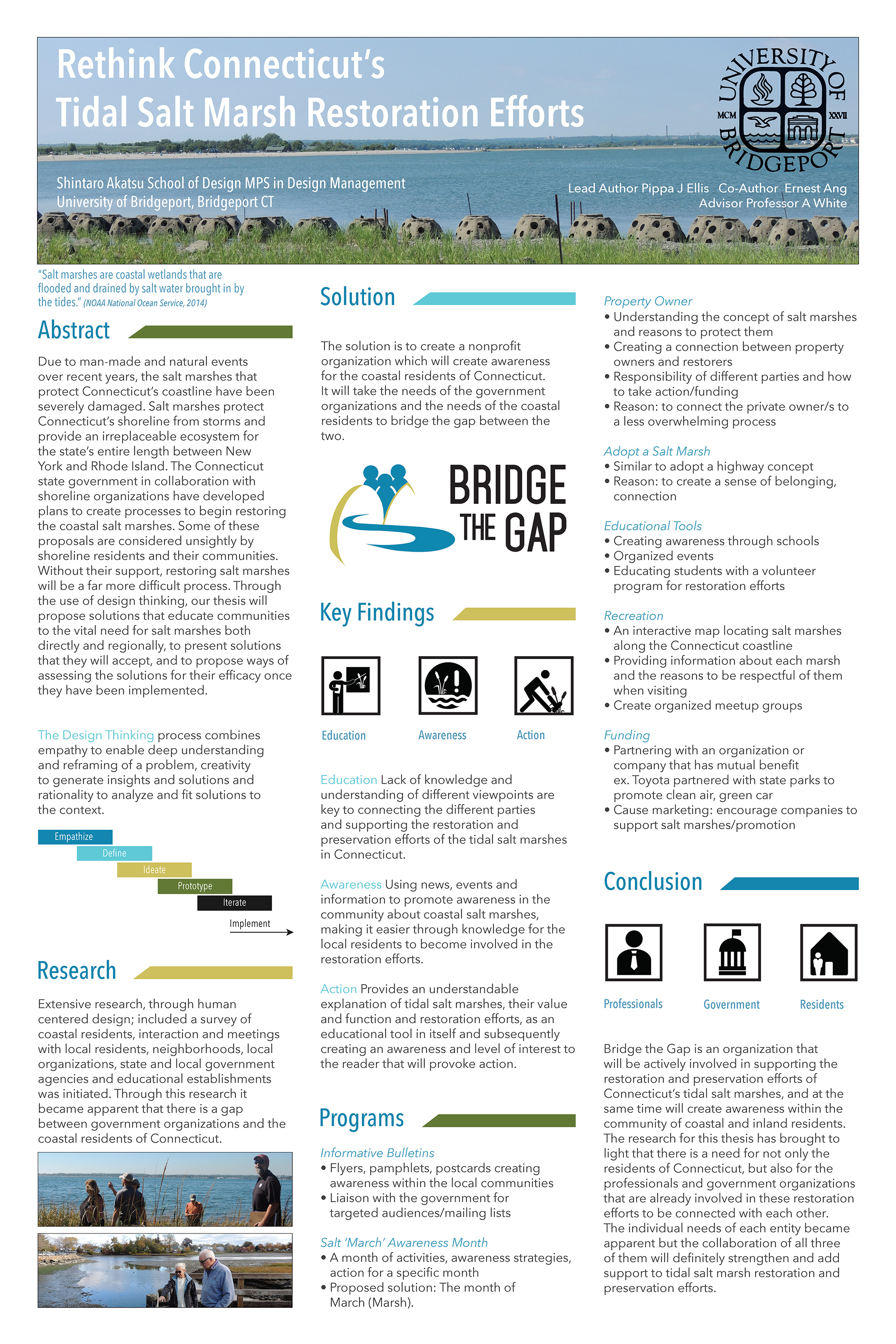 Bridge the Gap Rethink current restoration efforts of Connecticut’s tidal salt marshes so coastal residents will be more receptive of them. Due to man-made and natural events, the salt marshes that protect Connecticut’s coastline have been severely damaged. Salt marshes protect Connecticut’s shoreline from storms and provide an irreplaceable ecosystem for the state’s entire length between New York and Rhode Island. The Connecticut state government in collaboration with shoreline organizations have developed plans to create processes to begin restoring the coastal salt marshes. Some of these proposals are considered unsightly by shoreline residents and their communities. Without their support, restoring salt marshes will be a far more difficult process. Our thesis will propose solutions that educate communities to the vital need for salt marshes both directly and regionally, to present solutions that they will accept, and to propose ways of assessing the solutions for their efficacy once they have been implemented.